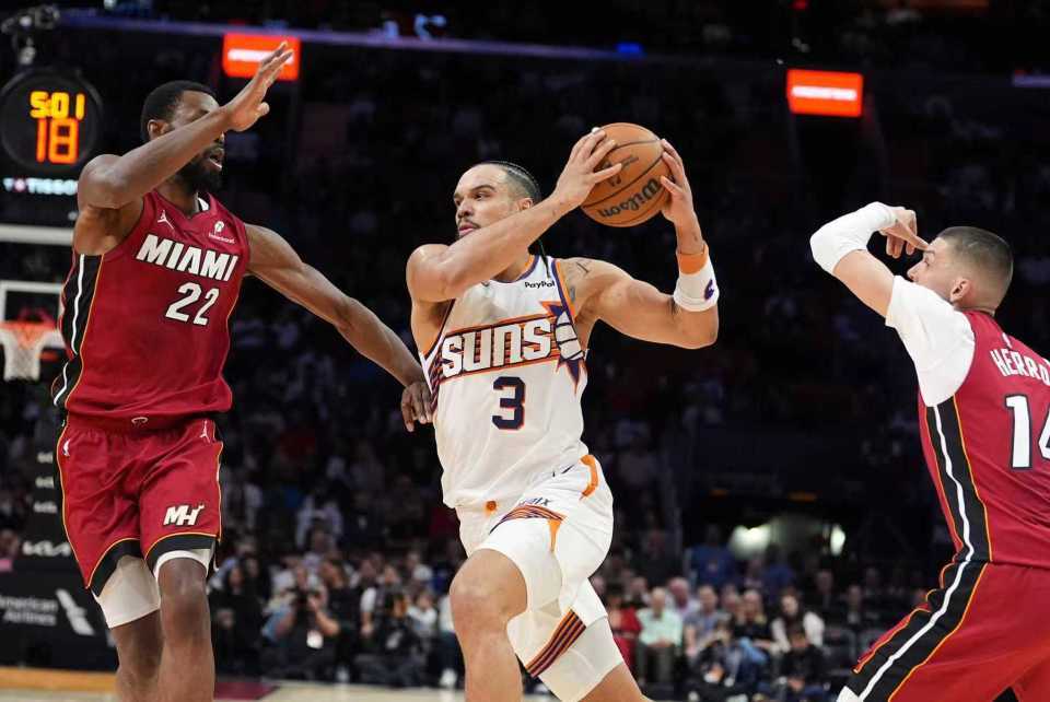 太阳过去3场连赢灰熊、尼克斯与奇才收获3连胜,热火过去3场连输森林狼、步行者与雷霆遭遇3连败。本场太阳缺少杰伦-格林,热火缺少罗齐尔。首节开局双方缠斗至9-9,热火连得4分,布克两罚全中,阿德巴约引领一波12-4攻势扩大10分优势。太阳回敬一波8-2攻势追到仅差4分,热火回敬一波9-5攻势拉开比分,首节比赛结束热火36-28领先太阳。首节热火26中16超过6成准星,其中三分12中4,阿德巴约5中4得到10+2+2;太阳27中10不足4成准星,其中三分11中4,阿伦3记三分11分。