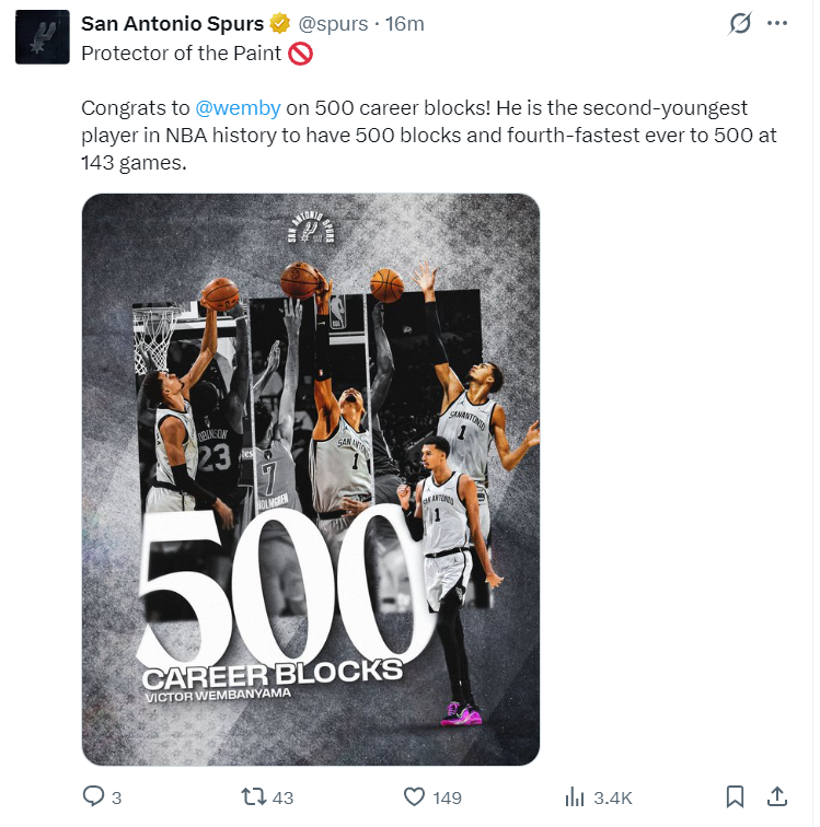 文班亚马达成生涯第500次封盖历史第二年轻,他仅用143场是历史第四快。